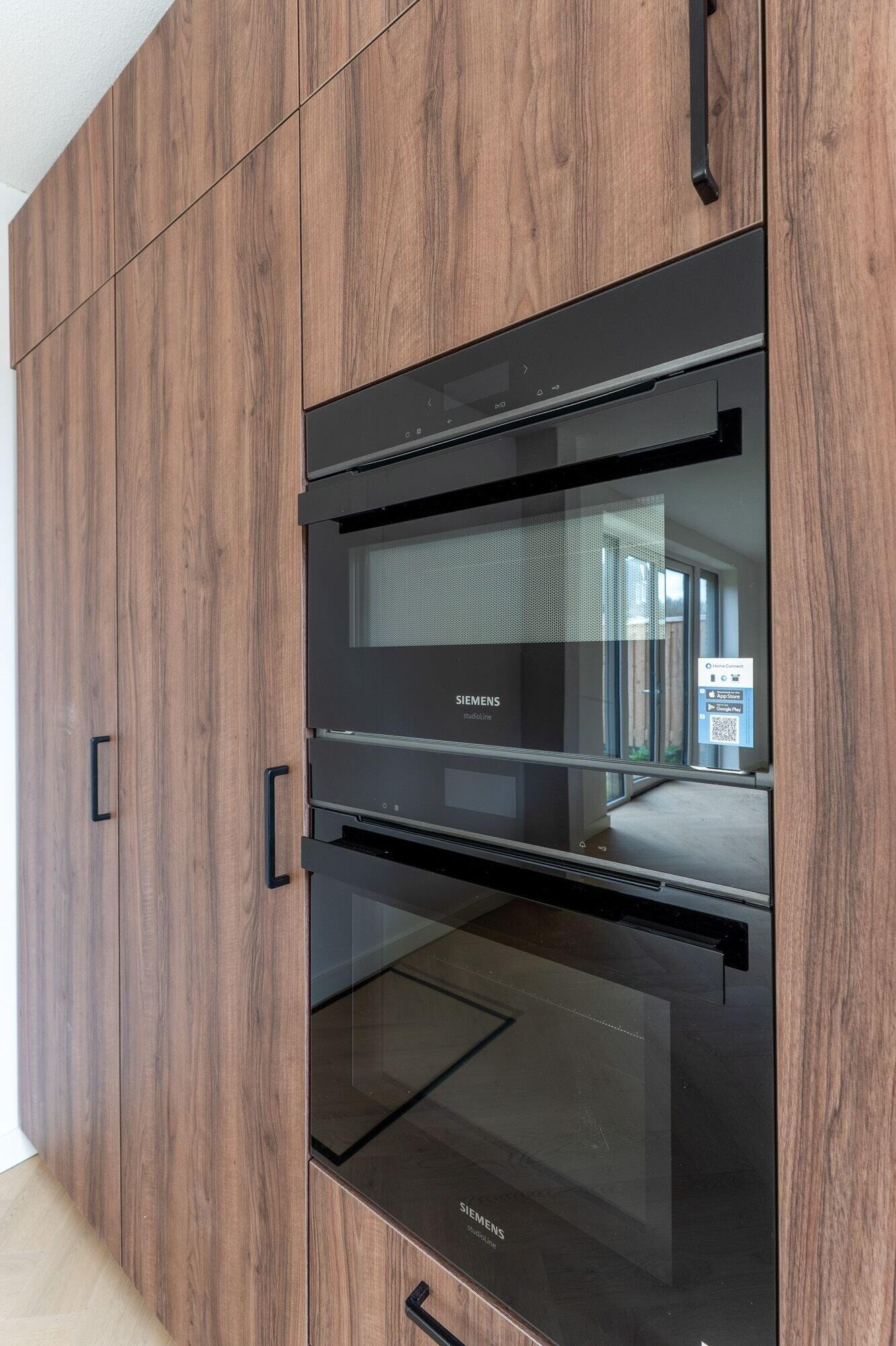 De woonkeuken, gesitueerd in de zij-uitbouw, is uitgevoerd in een U-opstelling met schiereiland en afgewerkt in warme Japandi stijl. De keuken is voorzien van luxe Siemens inbouwapparatuur, waaronder een grote koelkast en vriezer, vaatwasser, inductiekookplaat met geïntegreerde afzuiging en een Quooker. Hoge kasten en een zitbar maken het geheel compleet en zorgen voor een perfecte combinatie van comfort en design.