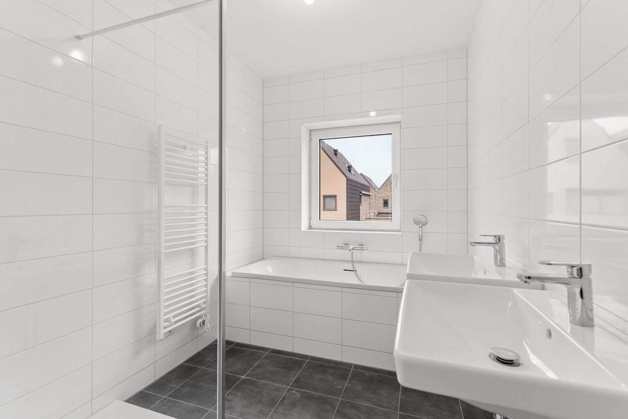 - Dubbele wastafel, inloopdouche, ligbad, en toilet