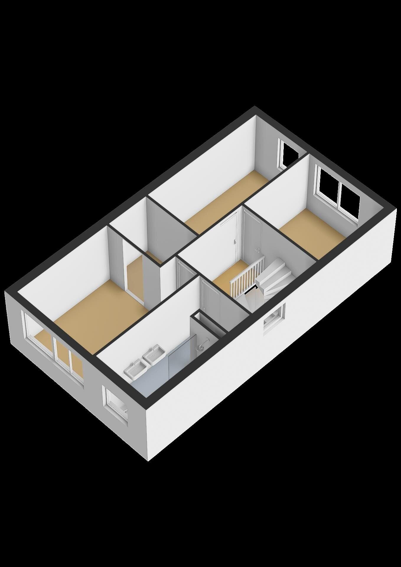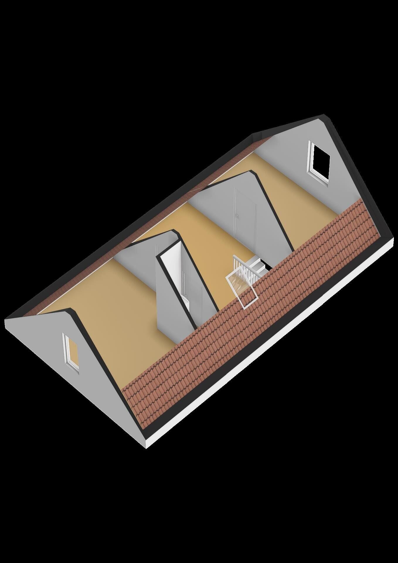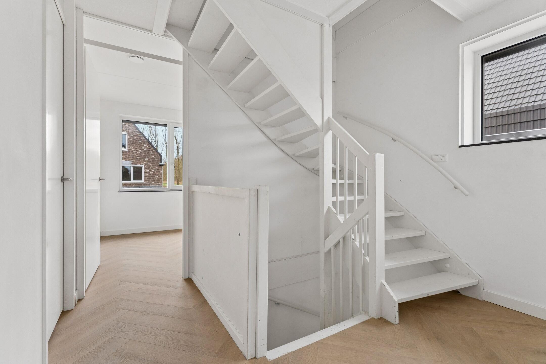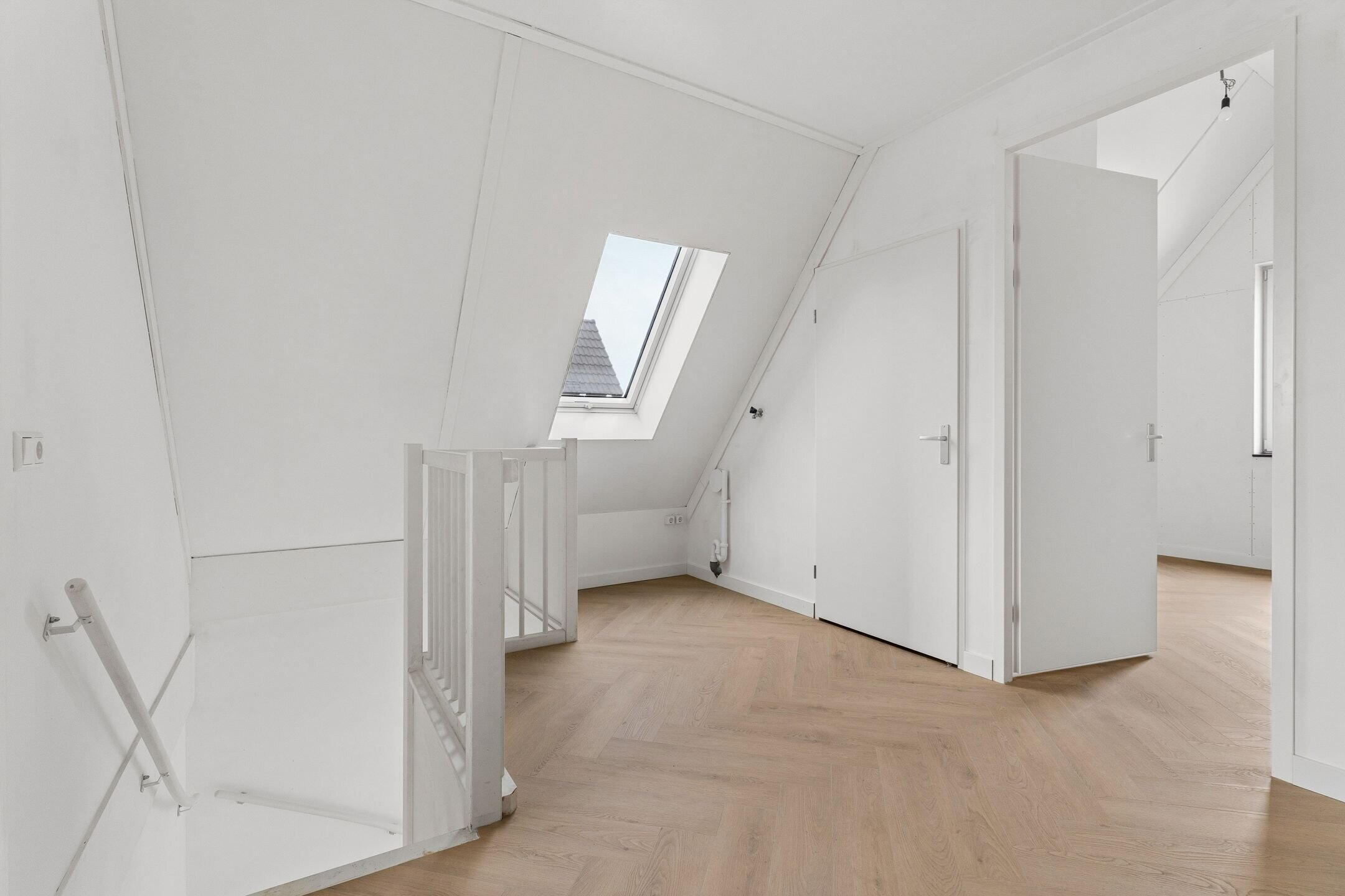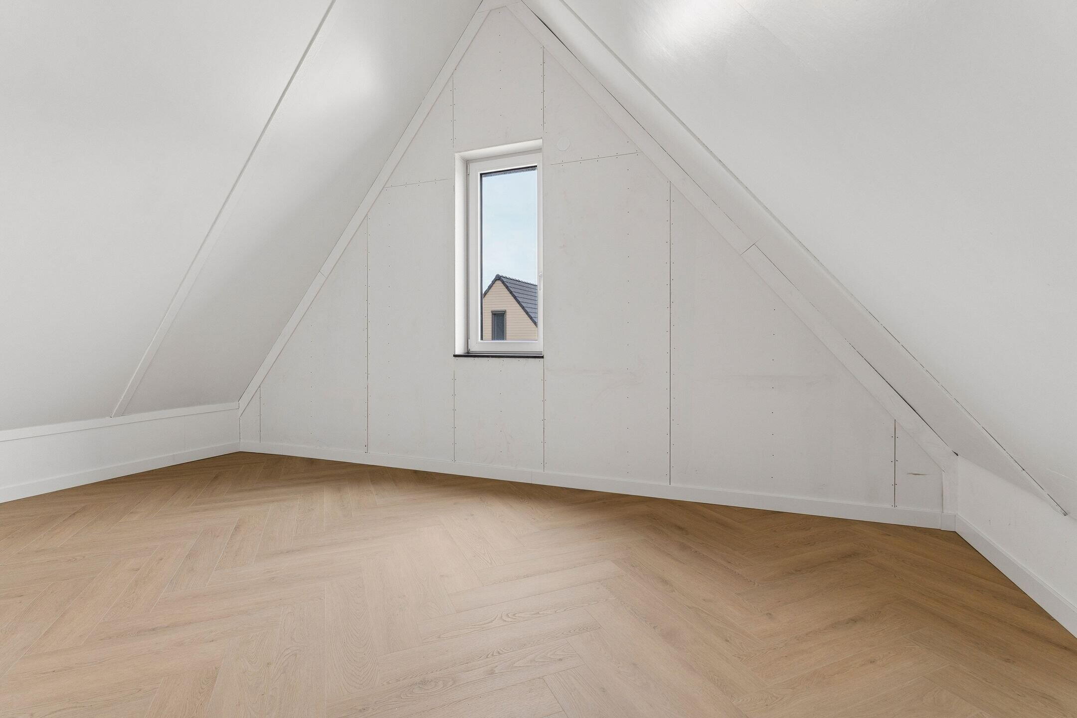 De vaste trap leidt naar de tweede verdieping. Op de overloop bevindt zich de opstelplaats voor de wasmachine. Via de overloop is toegang tot nog twee slaapkamers. De technische installaties zijn in een aparte ruimte opgesteld. De zolderverdieping oogt zeer licht en ruim door de vele raampartijen en hoge nok van 3.80. Op de overloop zou ook nog een werkplek of bergruimte gerealiseerd kunnen worden. De gehele verdieping is voorzien van vloerverwarming en een PVC vloer.